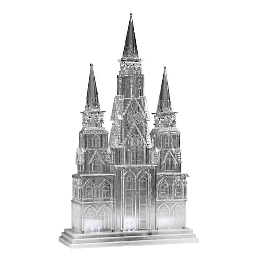 Ornate in design and majestic in stature, this three-spired cathedral will add a traditional taste to your holiday decorating. It is constructed of high-impact clear plastic and lit from inside with nine battery-operated white LED lights. Also featured is the option to play the time-honored holiday song Silent Night.