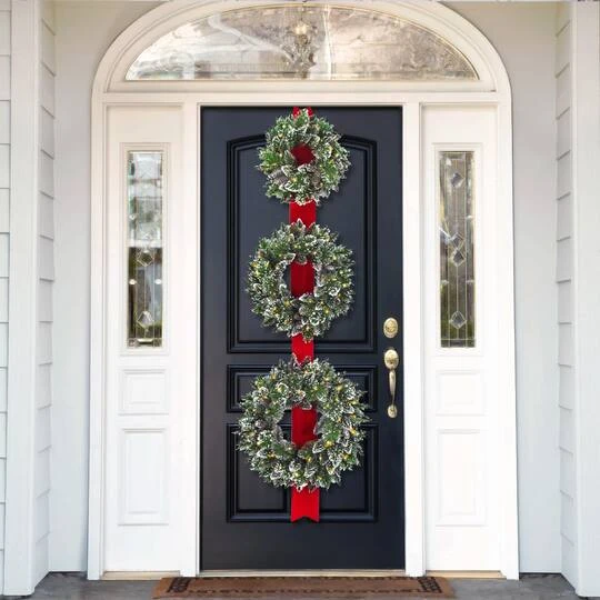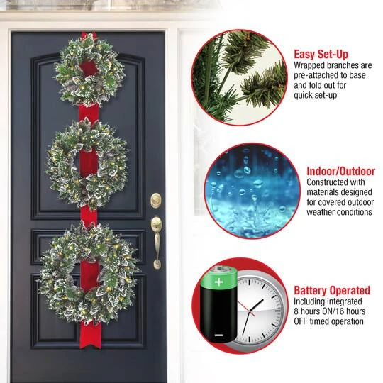 This Triple Wreath Door Hang decoration features a 77″ long red ribbon holding three wreaths, each with sparkling glittered tips and trimmed with pine cones. Wreath dimensions are 18″, 22″ and 26″ and all are pre-strung with a total of 100 battery operated warm white LED lights that are energy-efficient and long lasting. 6 hours ON/18 hours OFF timed operation. This door hang can be displayed in indoor or covered outdoor locations.