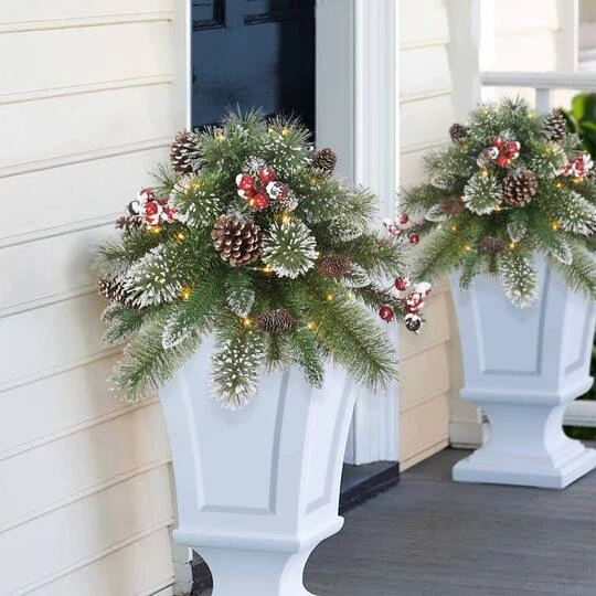 Get into the holiday spirit with the Puleo International Snowy Urn Filler. This 18-inch tall bundle of greenery with elegant snow-dusted pine needles, rich-colored berries, and realistic pinecones makes for the perfect inhabitant of your favorite festive urn and perfectly captures the ambiance of the wintry forests in your home. Decorated with 35 pre-attached warm white LED lights, this pre-lit foliage illuminates your home with a dazzling festive glow while eliminating the time-consuming hassle of hanging lights around your house. Powered by three AA batteries (sold separately), this pre-lit urn-filling greenery illuminates your home with a dazzling festive glow, and the timer function conveniently allows you to set a 6 or 18 hour lights-on period. The urn filler has a full and natural appearance with a total of 48 branch tips, gorgeous life-like branches, and a classic conical shape for an authentic wintry forest impression. Assembly is simple and quick– simply secure into the urn of your choosing with the three sturdy stakes, and flip the lights on to supply a near-instant pop of holiday joy! The hypoallergenic and needle-shed resistant branches offer a safer alternative to fresh-cut Christmas greenery, so you can welcome in friends and family for holiday celebrations without worry. This product is backed by a five-year warranty for years of quality use.