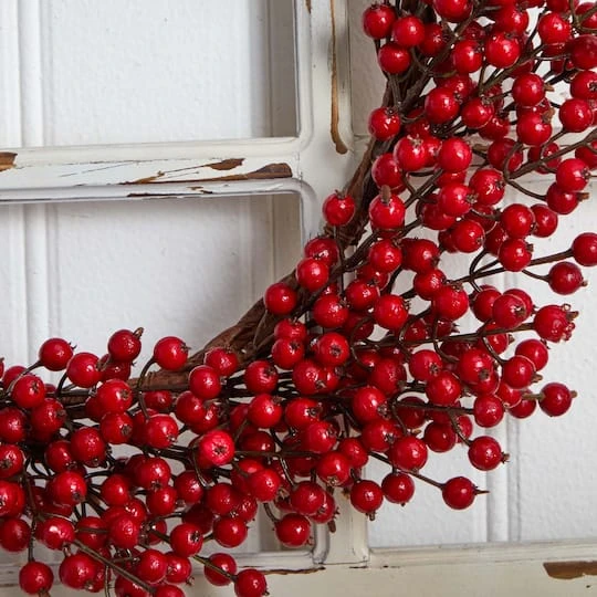 Adorable red berries are woven together to create this playful wreath. It may be tempting to pick off a faux berry to eat, but you should refrain–they only look real! It’s a delightful choice to add to country cottage and holiday decorations.Â