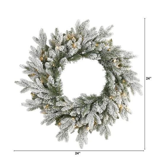 Showcase serious curbside appeal this holiday with this artificial Christmas wreath designed from seasonal evergreens and completely flocked with faux snow to evoke a winter setting. Pre-strung with lights to illuminate a wall or door, this decorative wreath makes for an inviting accent all throughout the season.