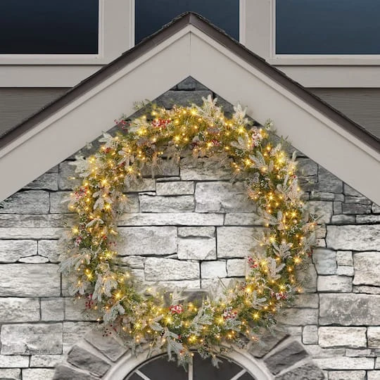 Embrace the joy of the holiday season with the Puleo International Pre-Lit Glittery Christmas Wreath. This 60-inch holiday wreath will add a joyful and elegant touch to the inside or outside of your home on the front door, a window, or a fence while welcoming in the Christmas spirit. Decorated with 300 pre-attached UL-listed clear incandescent lights, it illuminates the surrounding area with a dazzling festive glow while eliminating the time-consuming hassle of hanging lights. This pre-lit wreath has a full appearance with a total of 700 branch tips and gorgeous life-like branches with verdant green pine needles, further accented by rich-colored berries, dusted in a hypnotizing yet subtle glitter for a magical effect. The durable metal ring base offers easy and convenient hanging on any indoor or outdoor location of your choice with a natural look. This product is backed by a five-year warranty on the wreath and a two-year warranty on the lights for years of quality use.