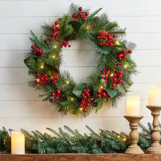 Welcome Christmas with this wonderful wreath. It features pine needles, large pinecones and leaves, as well as red berries. Place it on the door, entryway, windows and more for more traditional and classic touch.