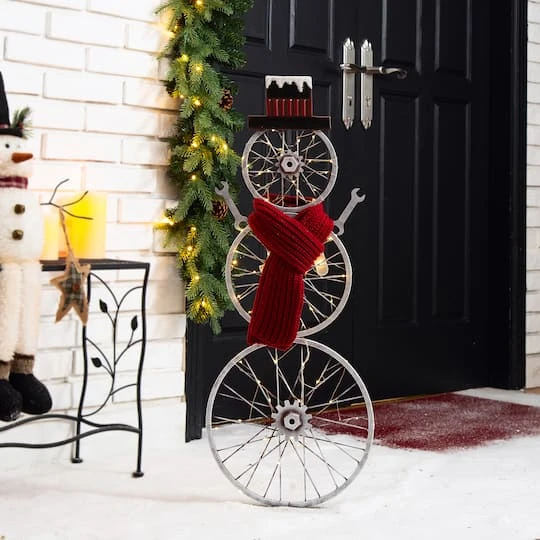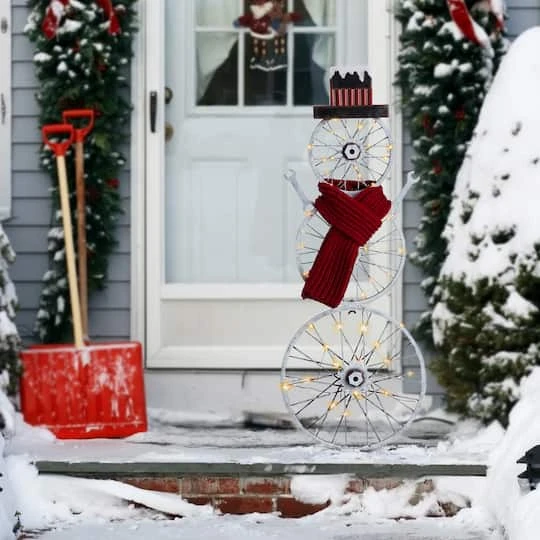 Decorate and celebrate this holiday with this metal bicycle wheel snowman porch sign. It features a snowman consisted of three whitewashed bicycle wheels, a black metal hat covered with snow, and a red knitted scarf. With a flat metal base, the sign could stand stable on the floor and is ideal for your porch and home.