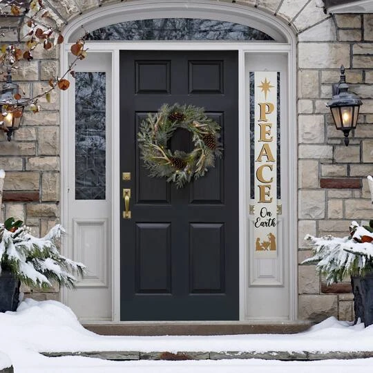 Enhance your holiday décor with this PEACE On Earth porch sign. It features festive phrases in gold with eye-catching fonts on white background. Religious and festal emblems will fill your Christmas celebration with peace and love. This porch sign will make a great entryway decoration or housewarming gift to welcome the holiday season.