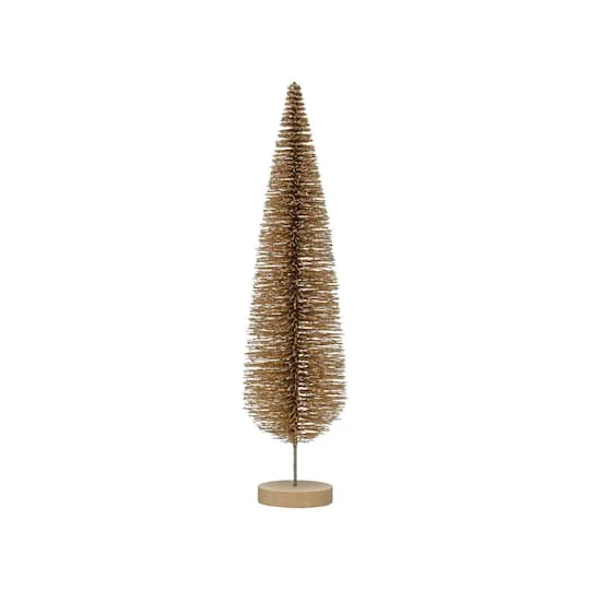 Experience the holiday season like never before with the “Christmas Magic” collection of luxurious holiday décor. This collection celebrates abundance in all its glory, evoking the spirit of classic holiday tales and cherished memories of roasting chestnuts on an open fire. Rooted in family traditions, each piece in this collection is designed to become an heirloom in the making, something that can be cherished and passed down for generations. With a careful eye for detail and a passion for timeless elegance, this collection transports you to a world of enchantment and wonder. This plastic bottle brush tree with glitter and wood base in gold color is perfect for adding a touch of sparkle to any holiday décor. Each holiday décor item is carefully crafted with the utmost attention to detail to ensure that it will be cherished for years to come.
